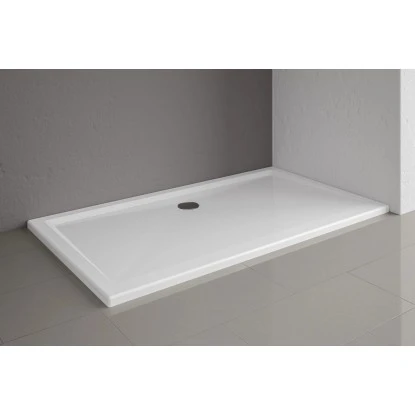 Die extraflache rechteckige Duschwanne hat die Maße 90 cm x 160 cm und ist Alpinweiß.