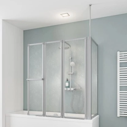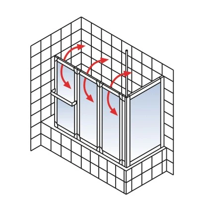 Diese dreiteilige Badewannenfaltwand mit einer feststehenden Seitenwand von Schulte zeichnet sich insbesondere durch ihre dominante Rahmung aus. Außerdem können die einzelnen Elemente der Faltwand für eine optimale Raumnutzung, auch in kleinen Bädern, um 360° gedreht und platzsparend an die Wand gestellt werden.