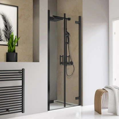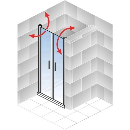 Die Schulte Pendeltür Toura besteht aus zwei 8 mm starken Glaselementen (Sicherheitsglas, ESG), welche mit je zwei pendelbaren Scharnieren an wiederum zwei eleganten, schwarzen Wandanschlussprofilen befestigt sind. Diese Türelemente sind mit Hilfe von zwei formschönen Türgriffen, die ebenfalls in modernem Schwarz überzeugen, flexibel nach innen und nach außen zu pendeln. Diese praktische Konstruktion ermöglicht etwa das einfache Auslüften des Duschbereichs nach dessen Nutzung, ohne die Duschtüren in den Raum zu bewegen.
